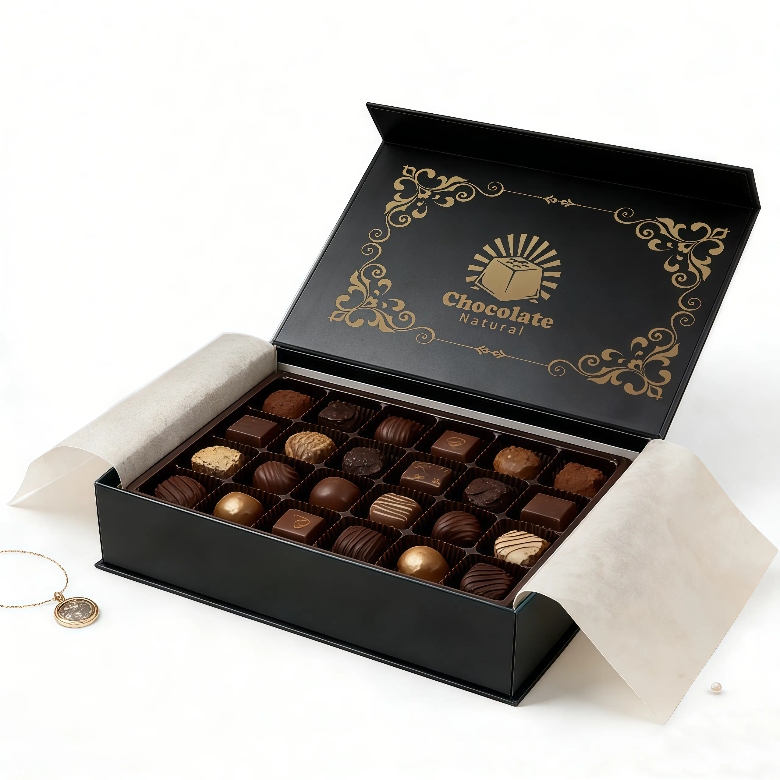 Welcome to purchase our custom rigid paper boxes. Discover our premium chocolate and confectionery collection, perfect for luxury treats, gifts, and gourmet assortments. Featuring a sturdy magnetic closure, food-safe divided inserts, and elegant gold foil detailing, it’s sophisticated presentation and secure protection combined. From size and rich color palettes to custom logos, decorative patterns, and tailored compartments, it is fully customizable to match your brand. Let us help your sweet creations stand out, beautifully and luxuriously.
