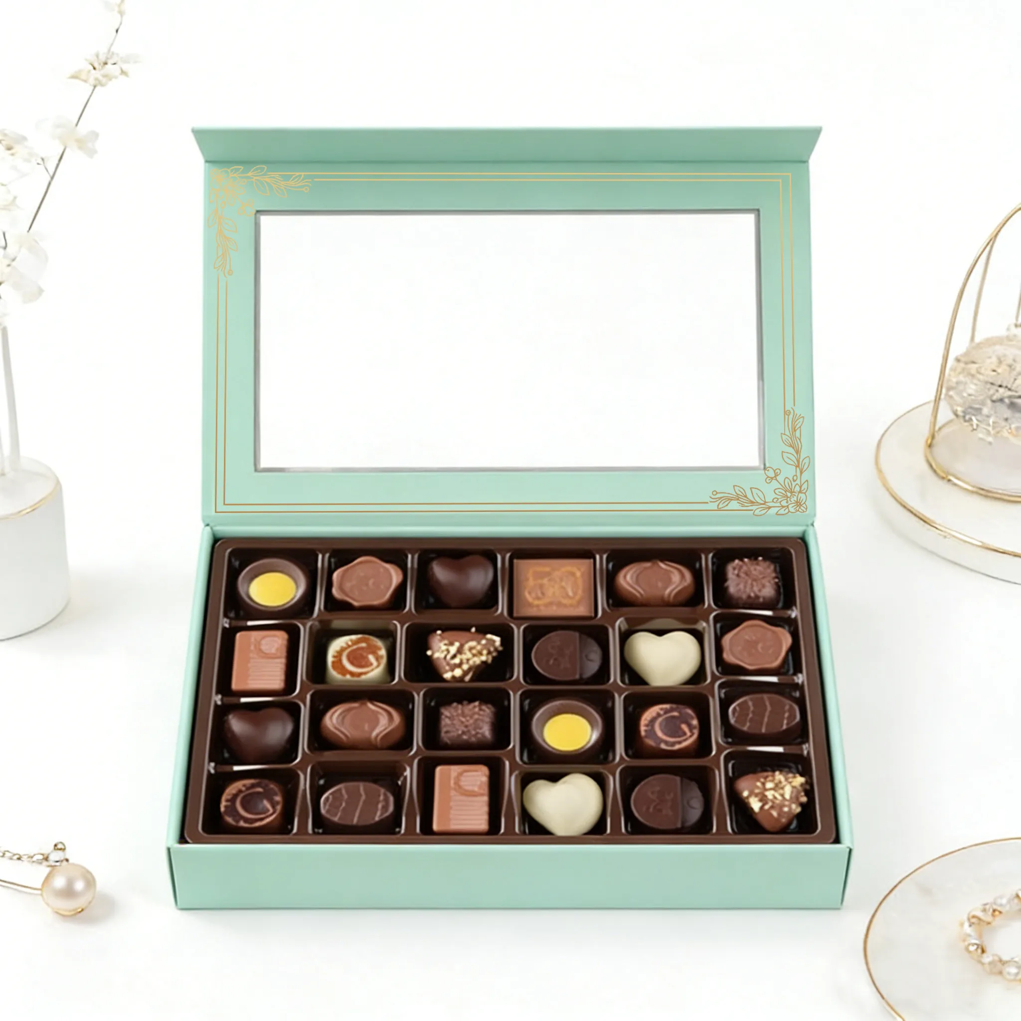 Windowed Magnetic Lid Design: These magnetic gift boxes feature a clear window lid, offering a tempting preview of the treats inside while keeping them secure with a smooth, satisfying magnetic closure.