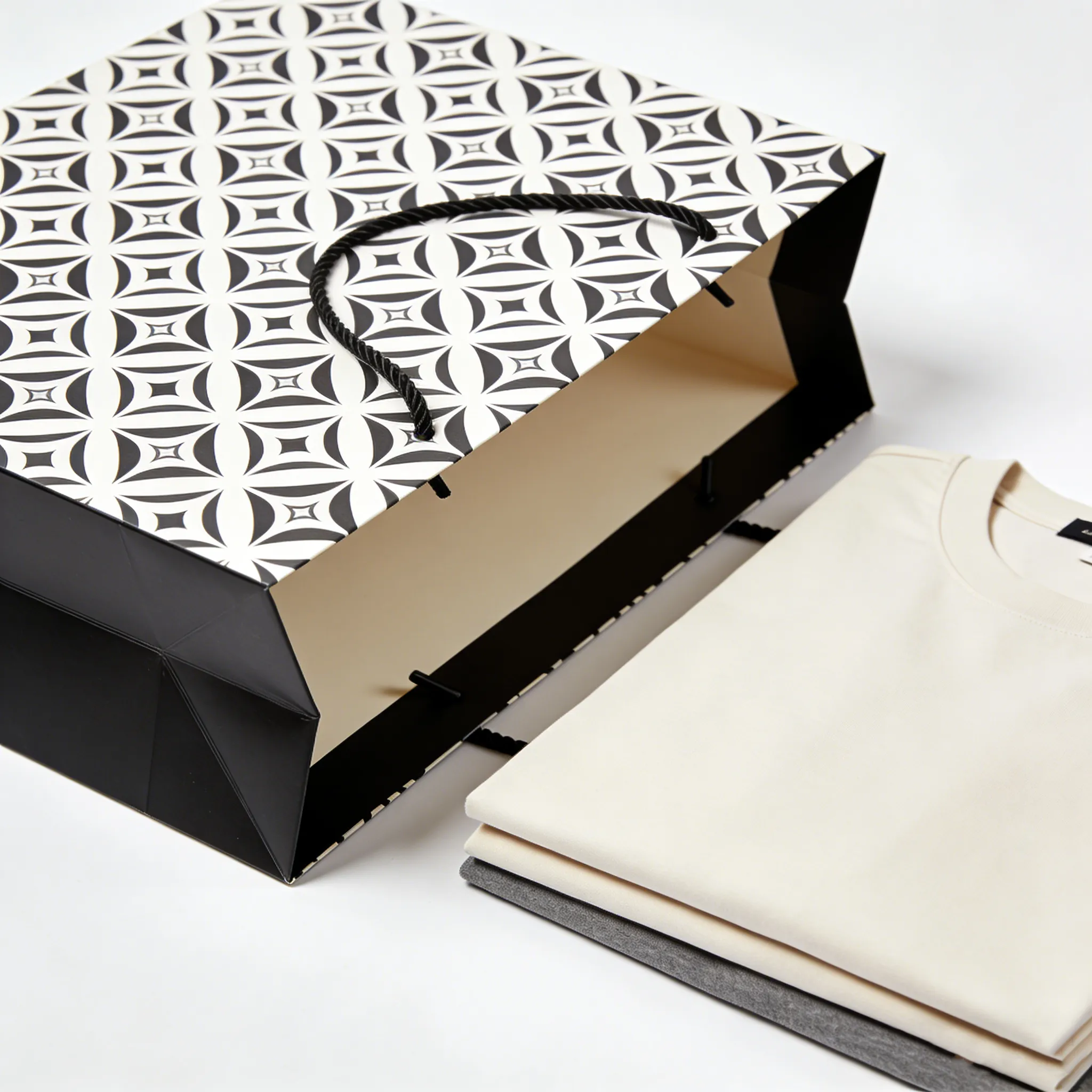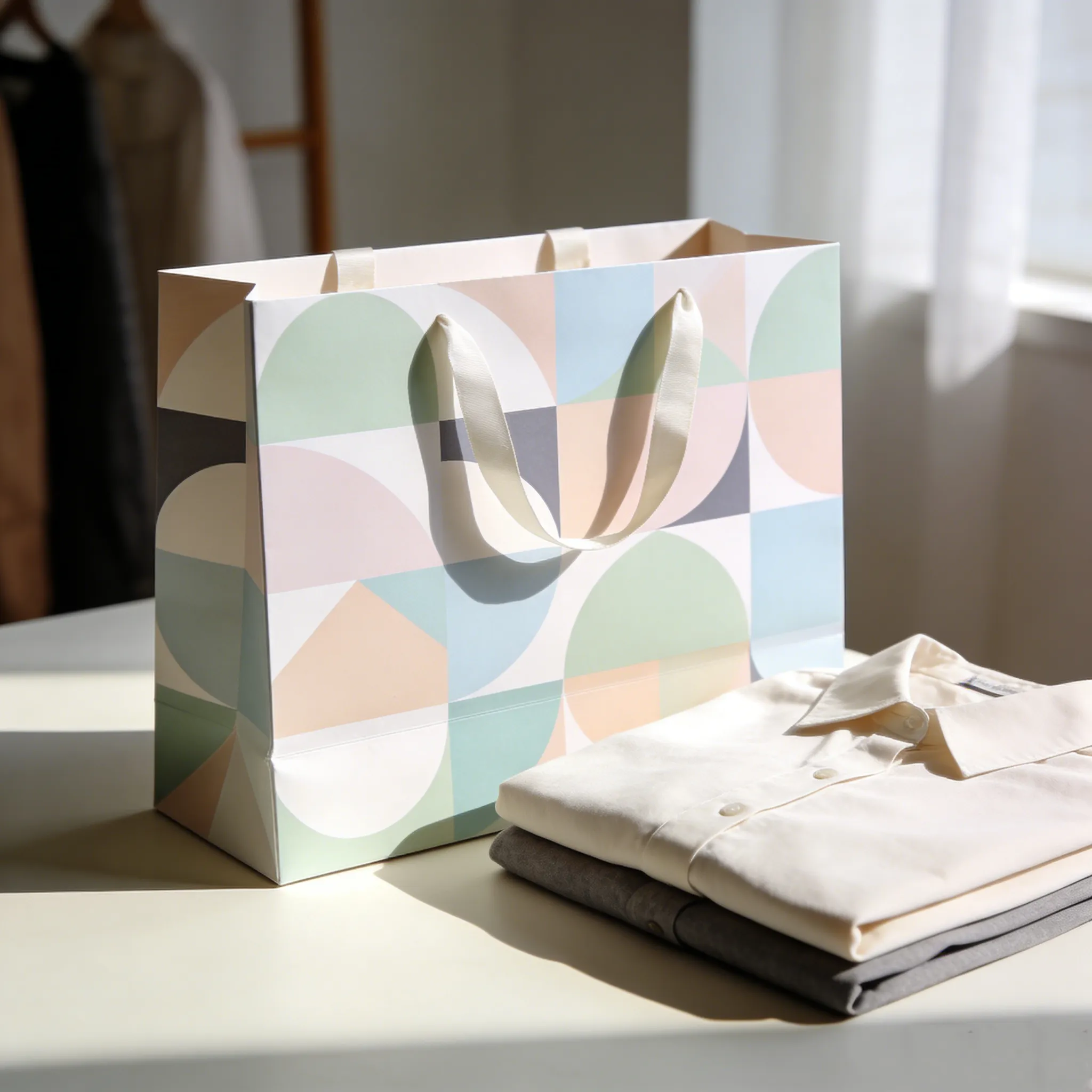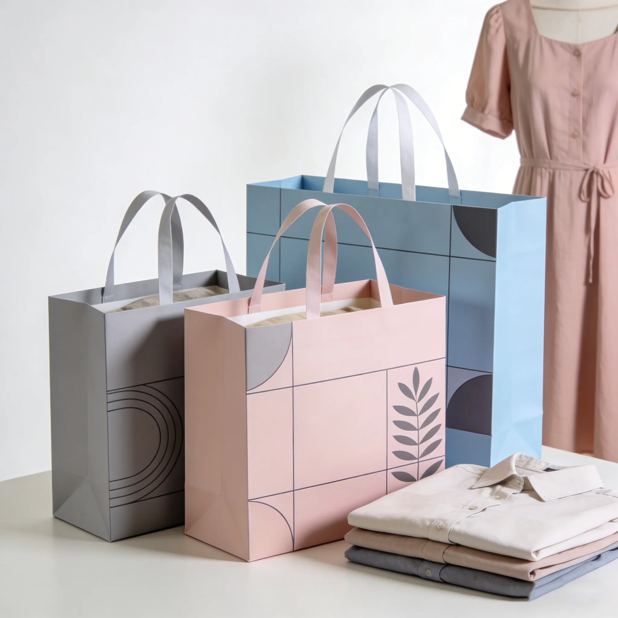 Welcome to purchase our bulk gift bags with handles are the ideal packaging solution for clothing brands, retailers, and wholesalers seeking durable and customizable paper bags. Featuring sturdy paper construction, reinforced handles, and elegant designs, from minimalist geometric prints to sophisticated monochrome patterns and earthy textures. These foldable retail paper bags reduce shipping costs while delivering premium brand presentation—perfect for fashion packaging, promotional use, and large-scale retail distribution.