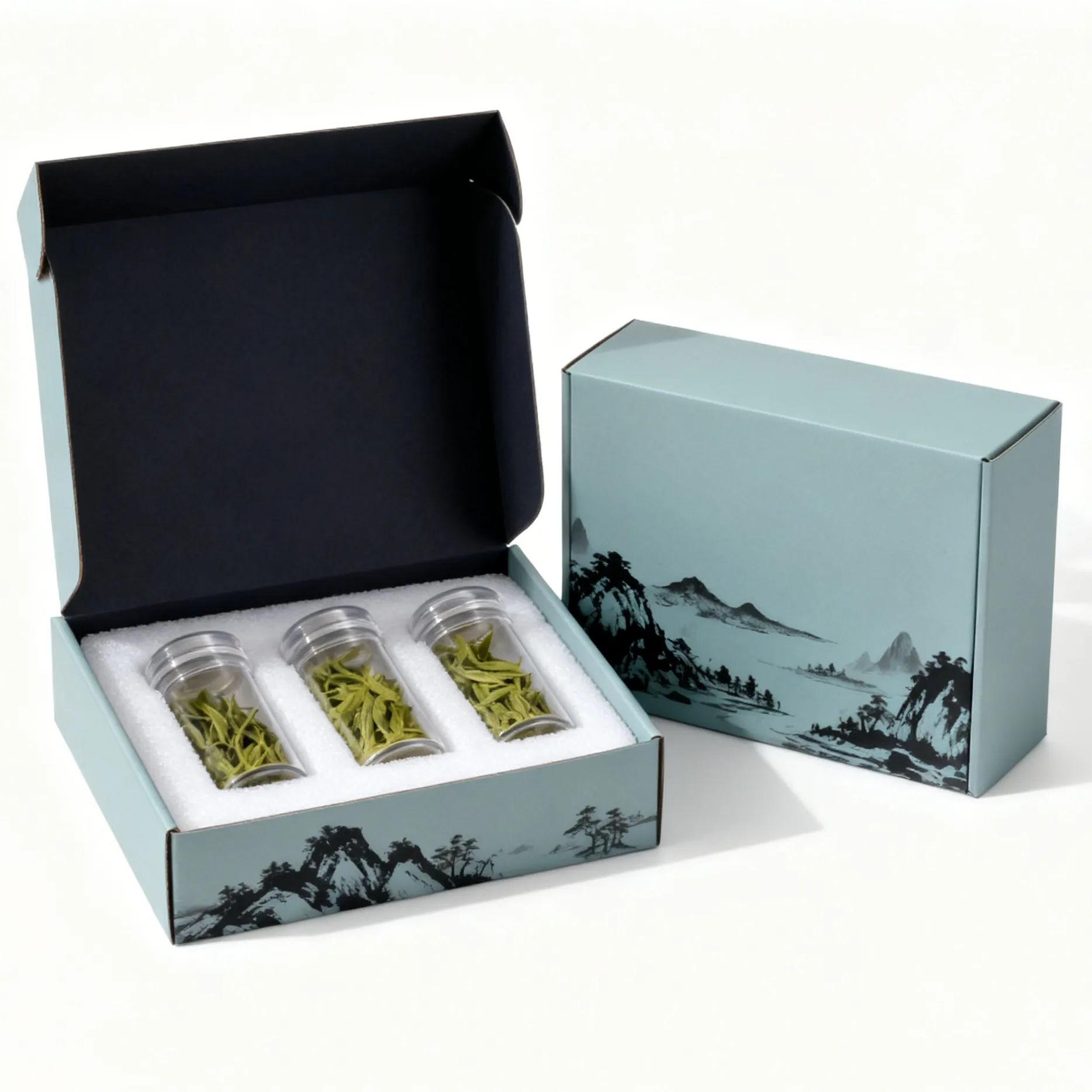 Welcome to purchase our mailing boxes wholesale, featuring a robust paperboard structure and custom-fitted inner supports. perfect for mini tea jar assortments, or single-serve tea portions packaging. These customizable, durable paper boxes support full-color branding, provide strong protection during shipping, and offer affordable bulk options for sustainable packaging buyers.