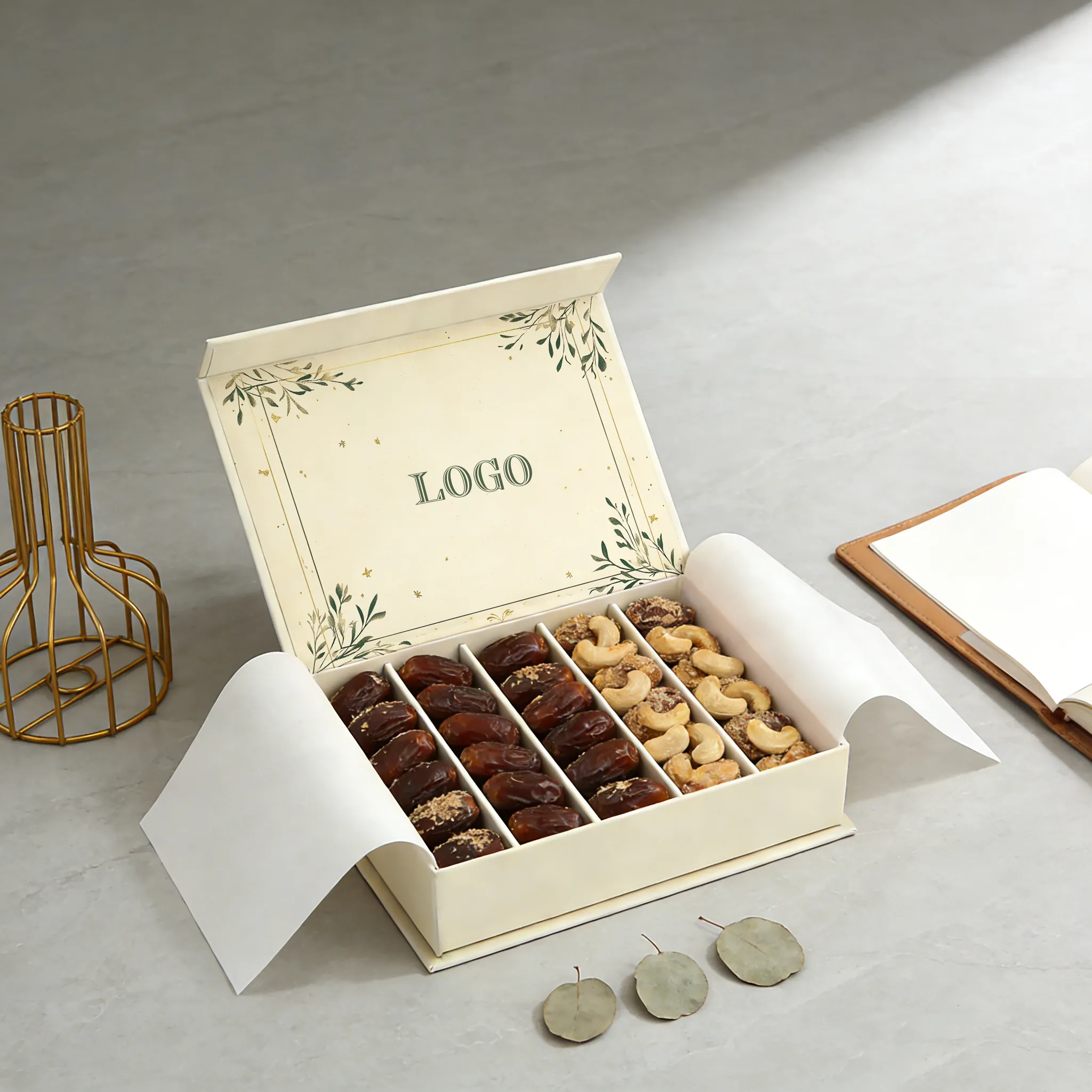 Fully Adaptable Customization: Our wholesale dates gift box fully customizable in dimensions, divider configurations, and surface branding; the boxes adapt to diverse gift items (from dates to chocolates) and align with unique brand identities.