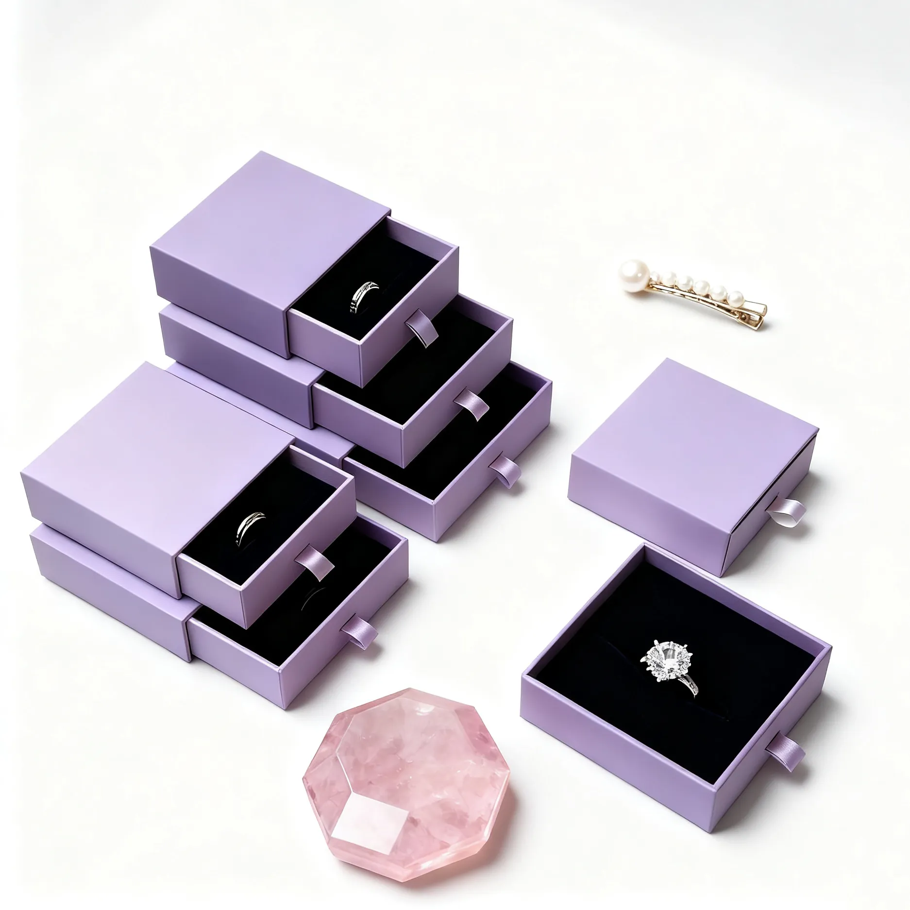 Suitable for Various Jewelry Categories: These custom drawer boxes can be finished with various processes such as hot stamping, silver stamping, UV coating, and embossing, suitable for packaging small luxury items such as bracelets, necklaces, pendants, beaded bracelets, and ring sets.