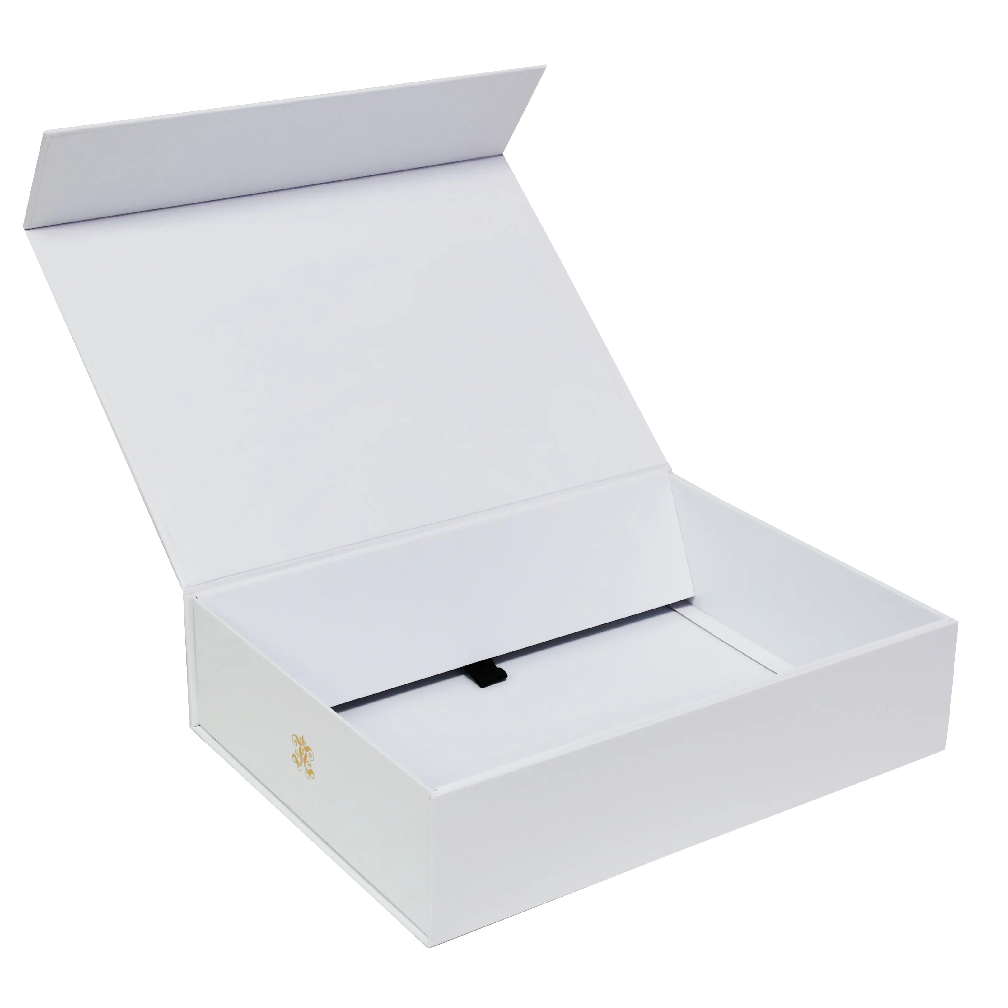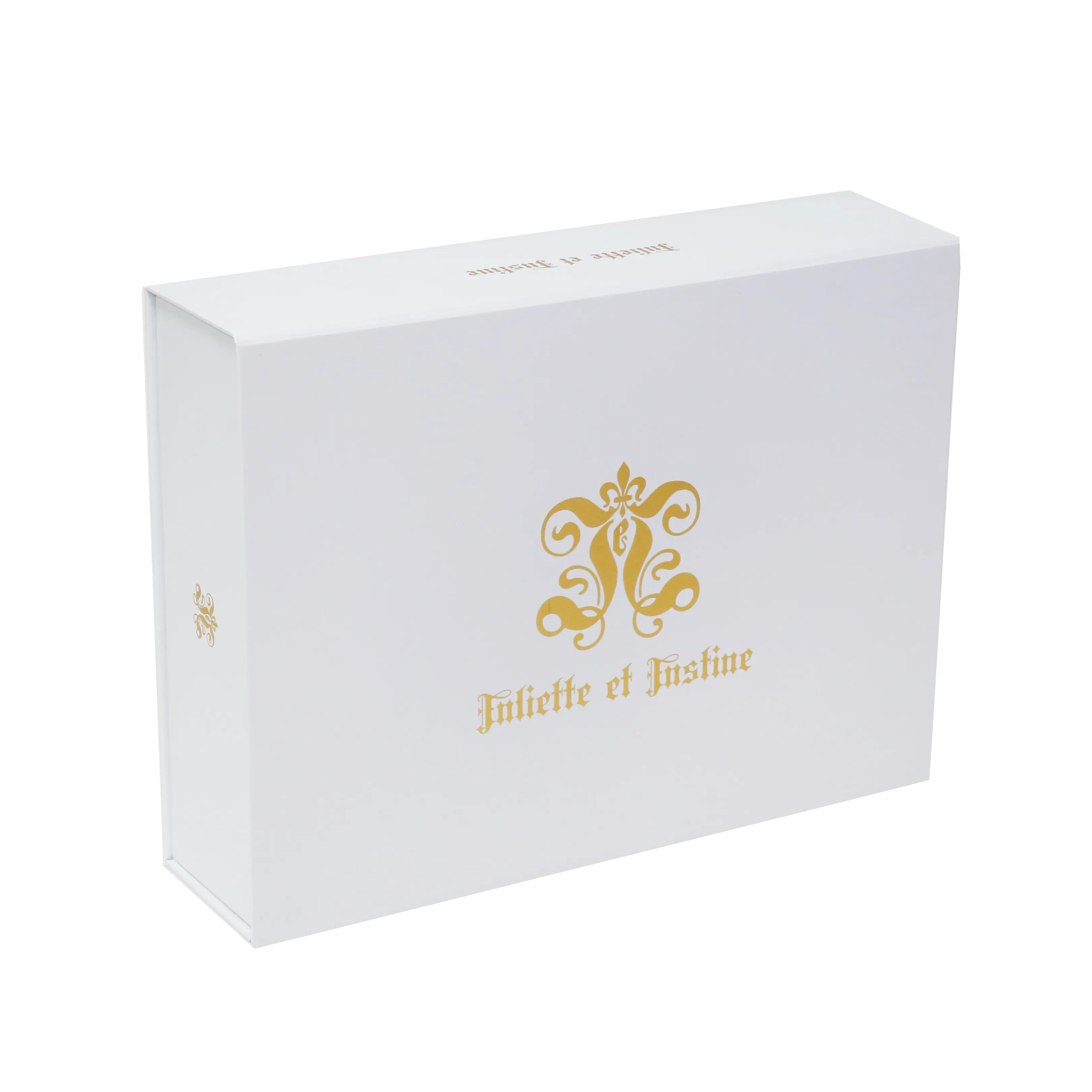 Minimalist Premium Aesthetic: This rigid magnetic gift box wholesale is crafted in a crisp white base with metallic foil accents (e.g., gold embossed logos, monograms), the box balances understated elegance with luxury — ideal for high-end gifting or brand presentation.
