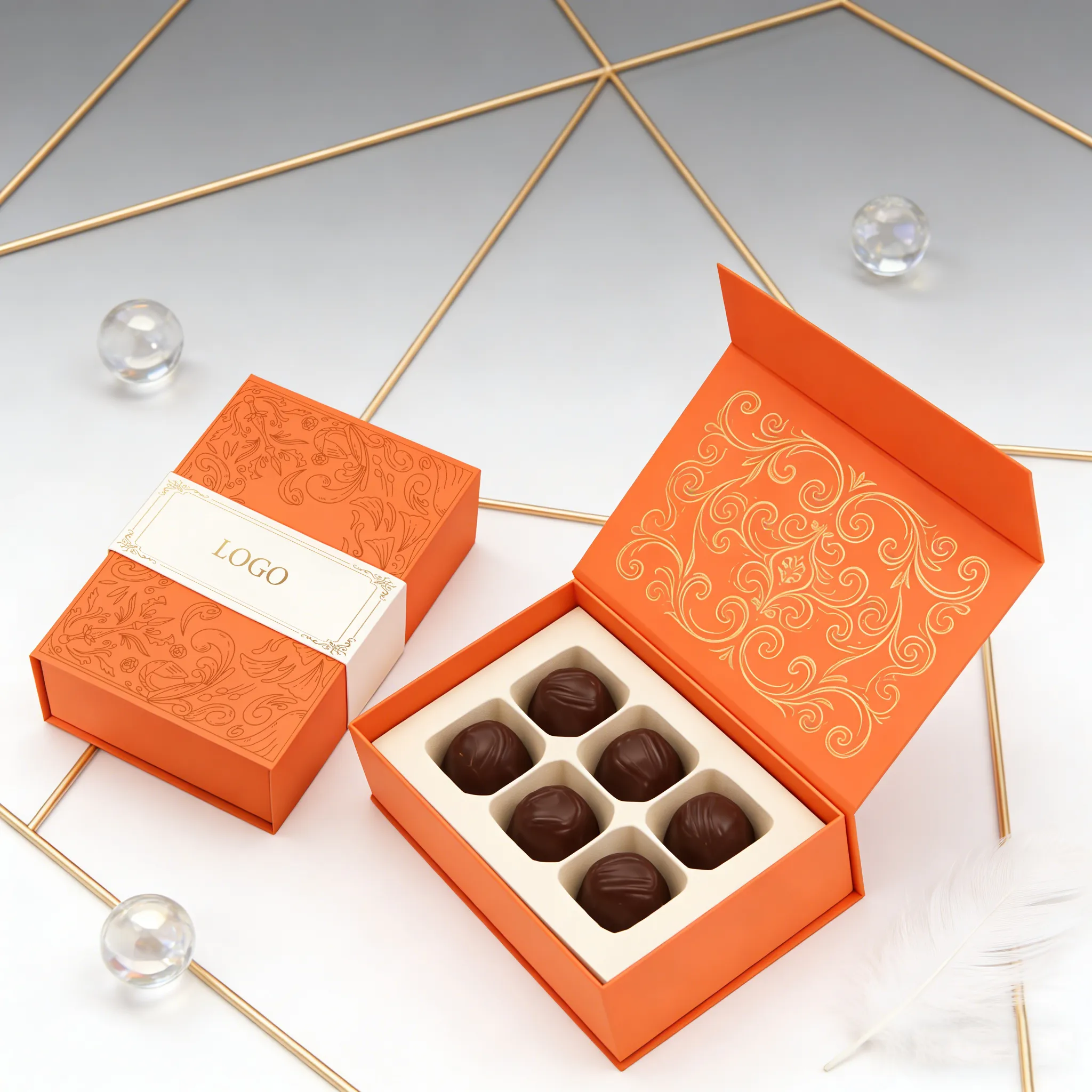 Multiple Sizes and Custom Insert Options: These wholesale chocolate candy boxes can be customized with box sizes available, with inserts made of EVA, molded pulp, paper cards, or PET, suitable for single, multi-piece, or combination chocolate packaging.
