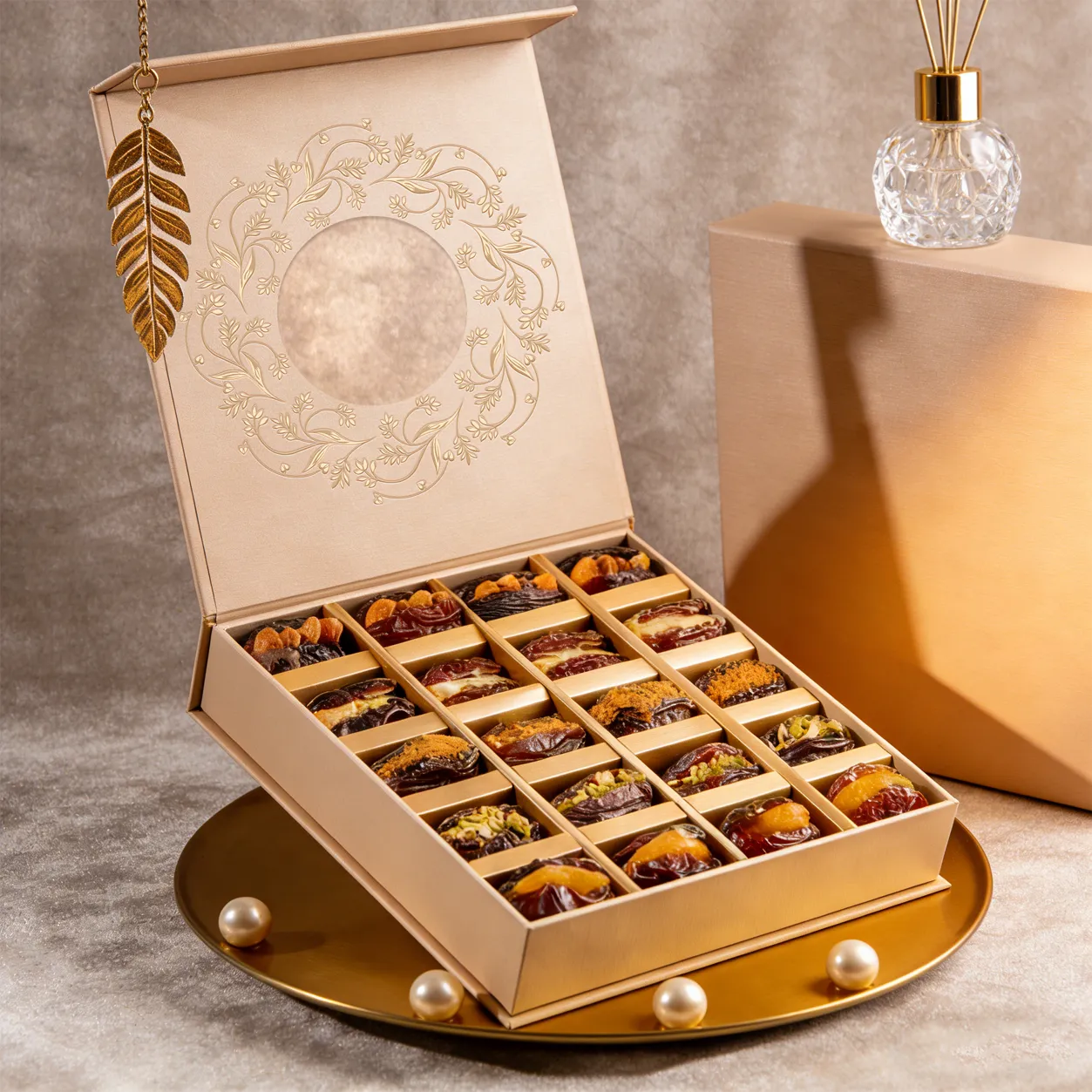 Versatile Size & Insert Adaptability: These premium wholesale dates gift boxes are fully customizable in dimensions. The magnetic paper boxes support swappable inserts (for confections, small gifts) to suit diverse product needs, with tailored branding options.