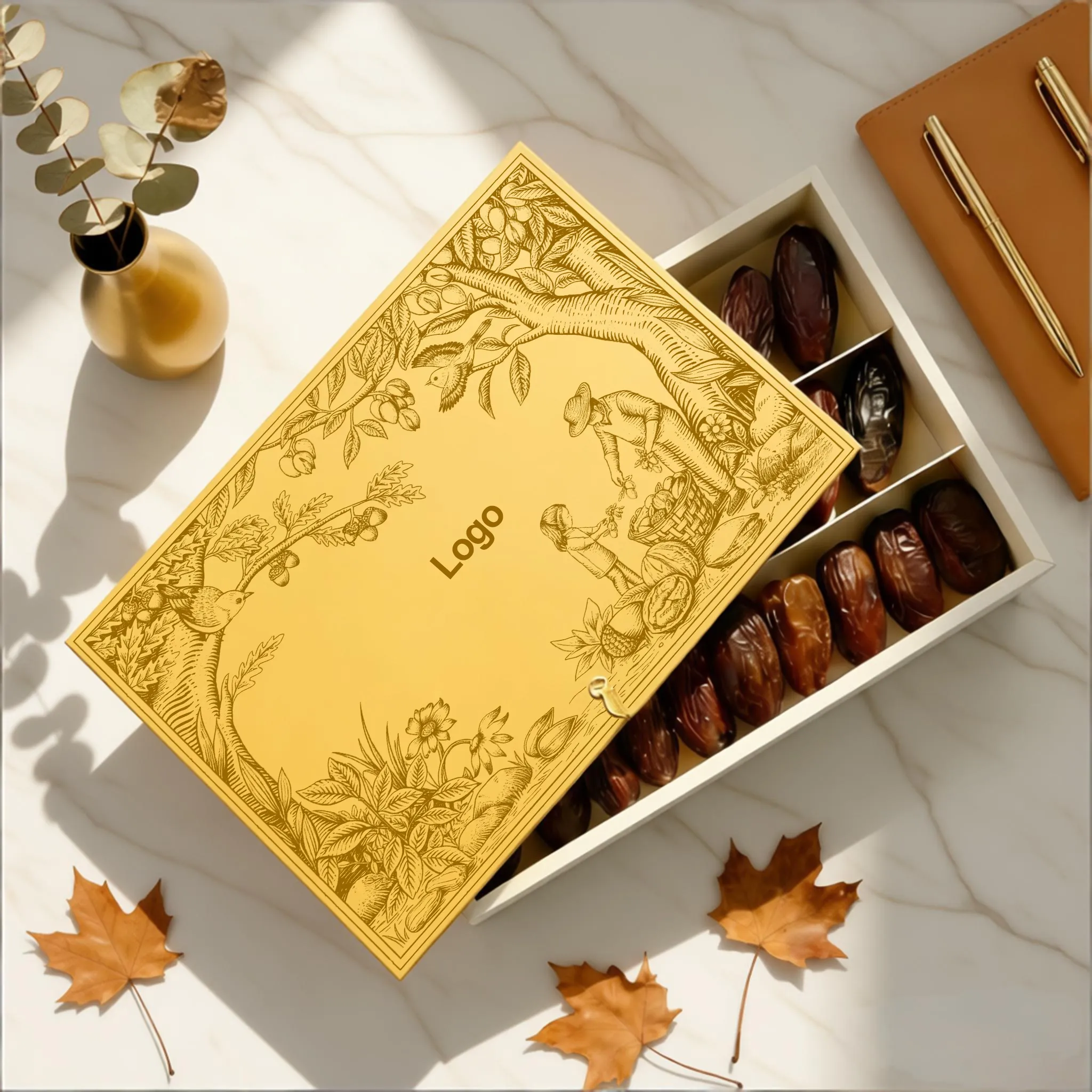 Luxurious Gold Foil Detailing: These wholesale stuffed dates gift boxes feature intricate gold foil embossing, botanical patterns, and personalized logo placement, creating a high-end, celebratory presentation ideal for dates and gourmet treats.