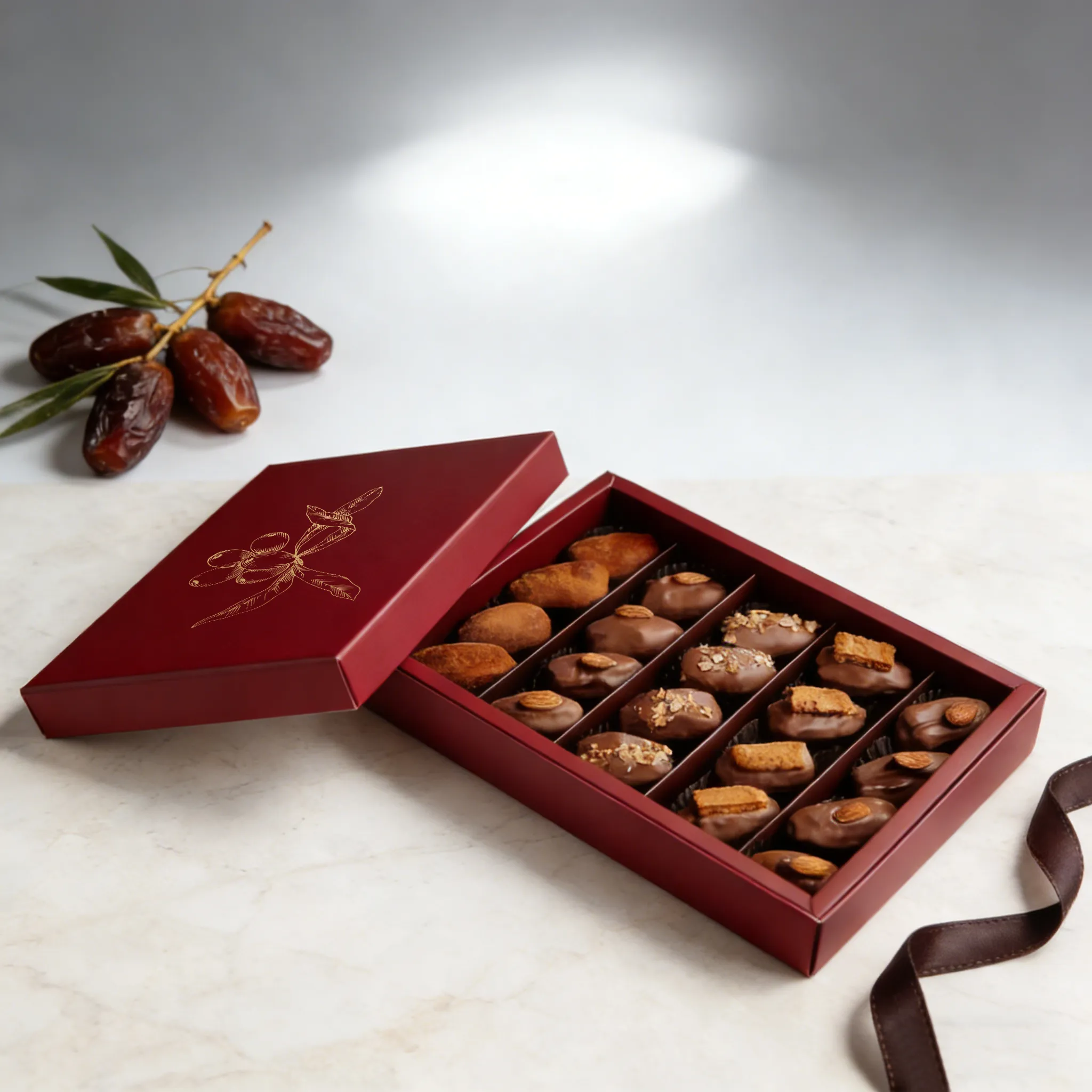 Welcome to purchase our wholesale stuffed dates gift box with custom lid and base design, offering premium rigid packaging for Ramadan gifts, Eid packaging, corporate gifting, and high-end chocolate date brands. Fully customizable with logo printing, sizes, finishes, and food-grade inserts, ideal for wholesale, OEM, and private label packaging solutions.