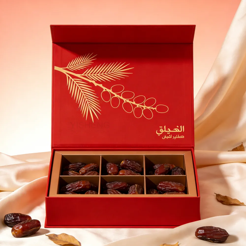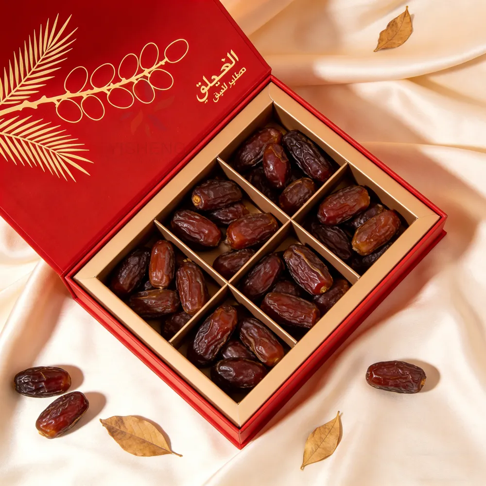 Welcome to purchase our custom magnetic closure boxes. Discover our premium collection, perfect for gourmet dates, traditional treats, and festive gifting. Featuring a secure magnetic closure, divided food-safe compartments, and elegant embossed or foil palm leaf detailing, it’s refined presentation and practical organization combined. From size and warm tones to custom Arabic motifs and tailored inserts, it is fully customizable to reflect your brand. Let us help your offerings stand out, beautifully and memorably.