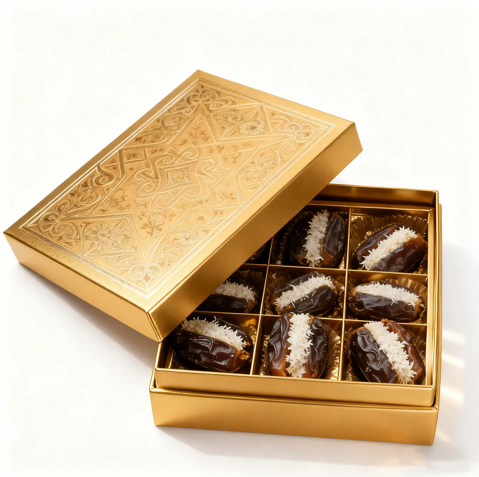 Food-Grade Partitioned Inserts: These custom dates gift boxes include a food-safe, compartmentalized paper tray, ideal for holding dates, stuffed confections, or chocolates, and the insert can be custom or swapped for non-food uses.