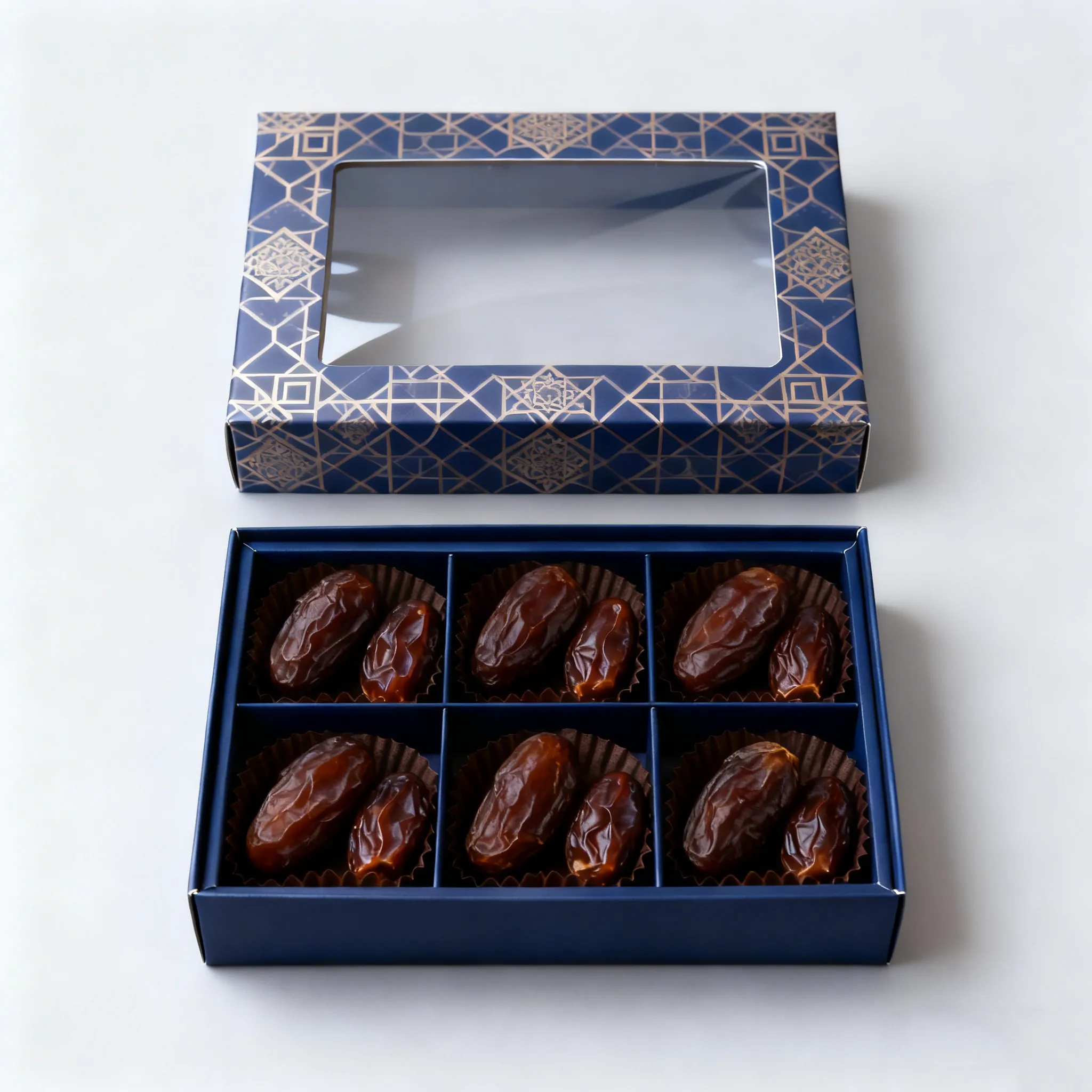 Food-Safe Compartmentalized Liner: These custom dessert boxes come with a food-safe, sectioned inner liner that keeps items (dates, confections, desserts) neatly organized and protected.